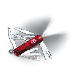 From the renowned company that created the Swiss Army knife a century ago comes this set of tools to tuck into your pocket, purse, glove compartment, fishing-tackle box, or anyplace else where it may come in handy. Measuring just 2-1/4 inches long--smaller than a pack of gum--and sheathed in the famous Swiss Army red plastic, the Midnite Minichamp is a toolbox and manicure kit small enough to fit into a pocket or clip onto a key ring and features a new LED mini white light. A valued companion that provides security and confidence, this pocket knife consists of 16 separate features and carries